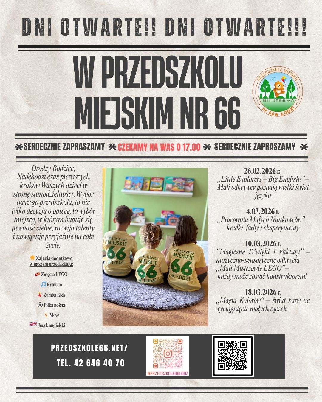 Rodzice/ prawni opiekunowie dzieci, które zostały po raz pierwszy przyjęte do Przedszkola Miejskiego nr 66 w Łodzi na rok szkolny 2025/2026 mają obowiązek w terminie 02 - 20 czerwca 2025 r. dostarczenia do placówki dokumentów rekrutacyjnych z systemu "Nabór": - wniosek, - załączniki i oświadczenia potwierdzające...