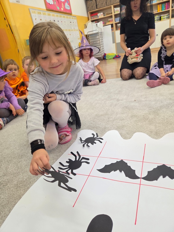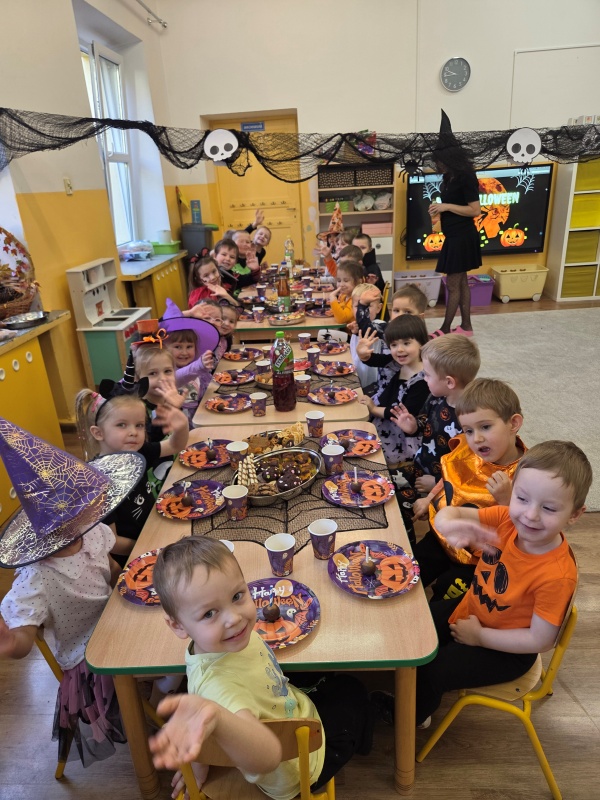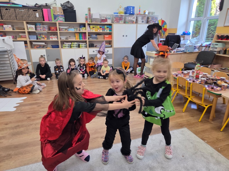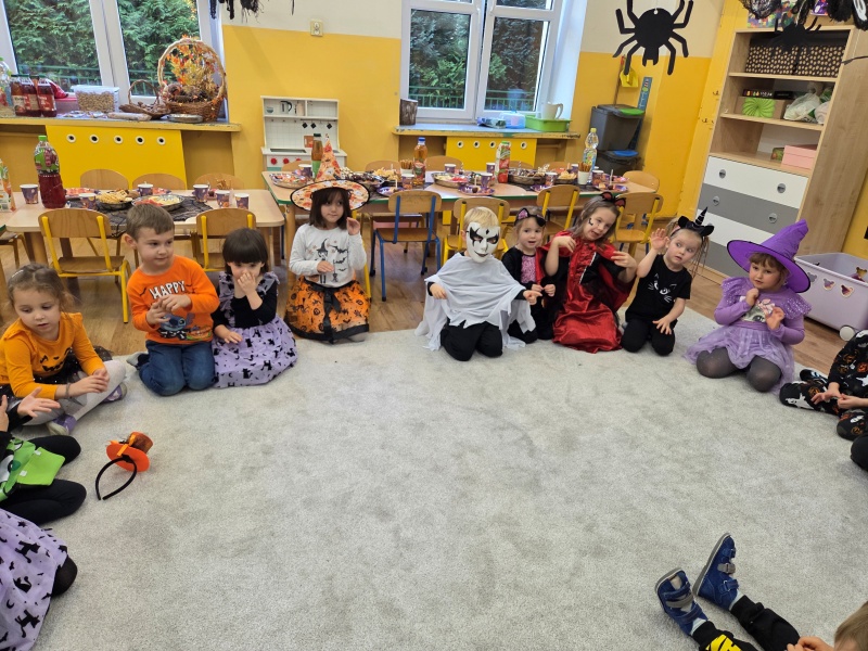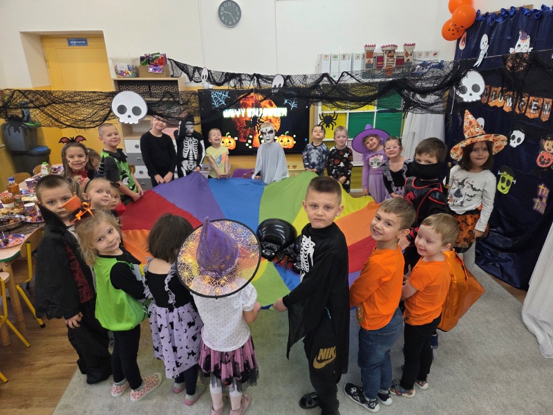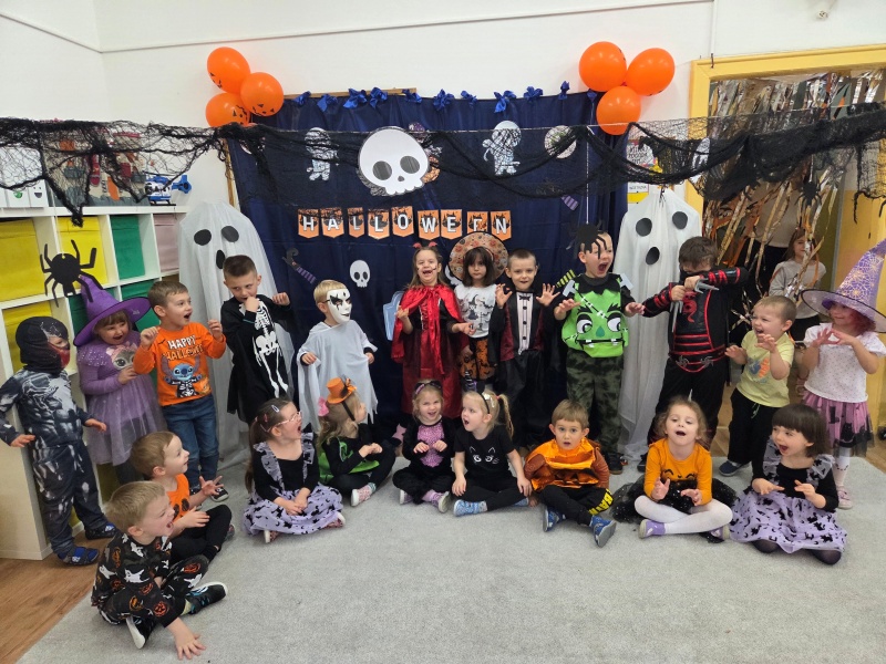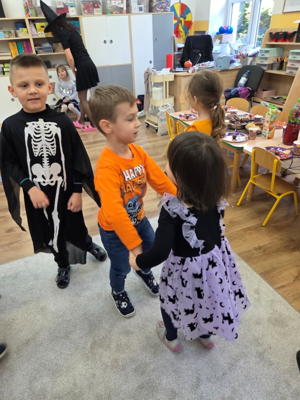 Dziś „Nutki” świętowały Halloween w formie balu. Dzieci przyszły w różnorodnych, „strasznych” przebraniach - od czarownic i wampirów, przez szkielety, aż po duchy i potworki. Były tańce, gry zespołowe, zabawy z rekwizytami i słodki poczęstunek. Uśmiechów nie brakowało, a sala zamieniła się w prawdziwie dyniowo-pajęczynową krainę!