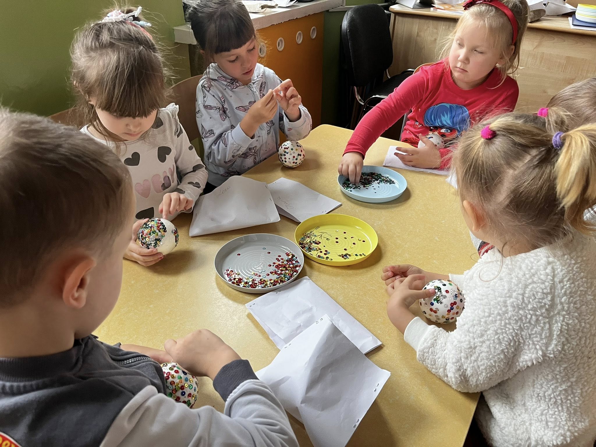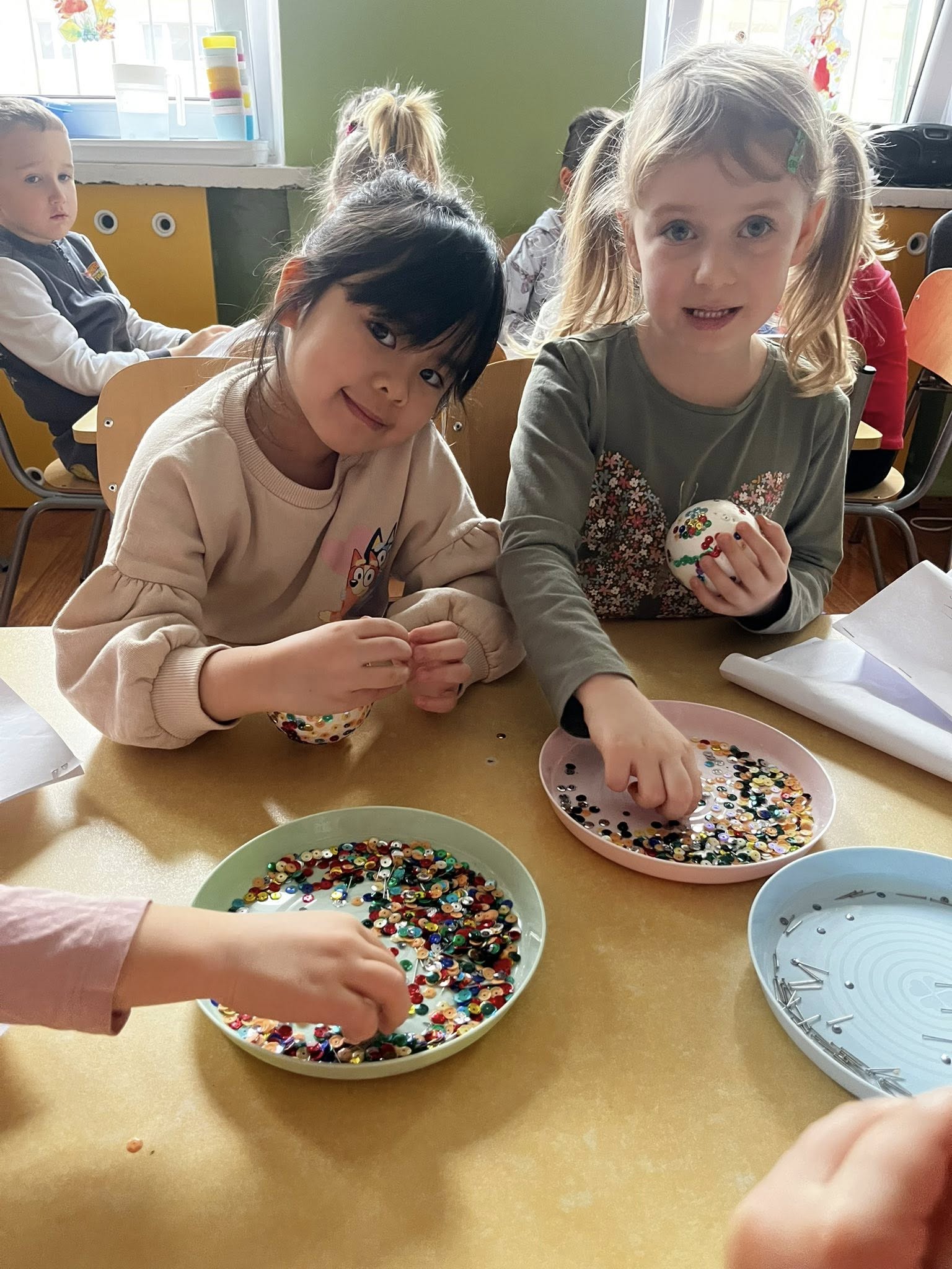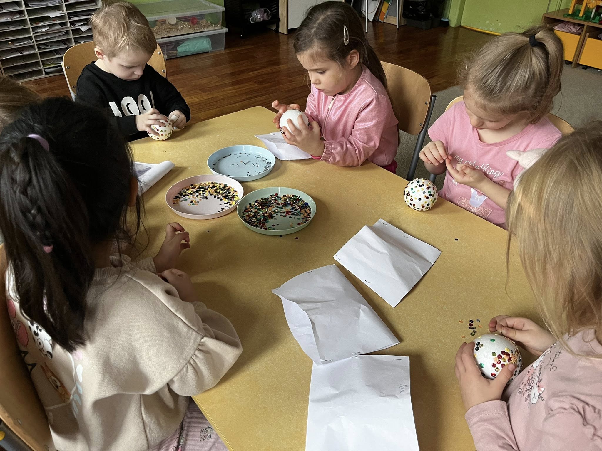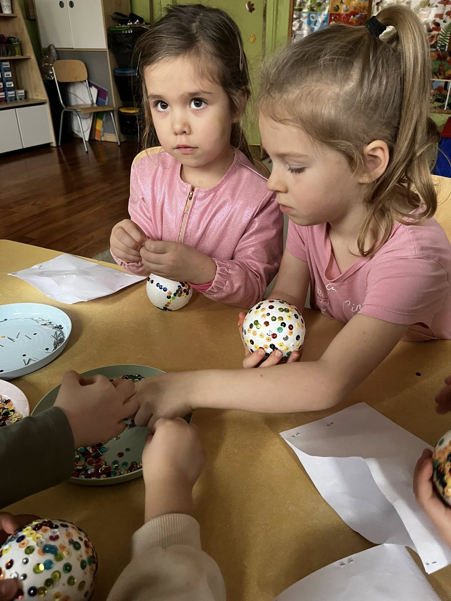 W grupie Motylków tworzymy świąteczne bombki styropianowe ozdabiane cekinami. Dzieci samodzielnie przypinają kolorowe cekiny szpileczkami, rozwijając kreatywność, cierpliwość i zdolności manualne. To prosta, efektowna i bardzo lubiana forma wspólnej, przedświątecznej pracy.