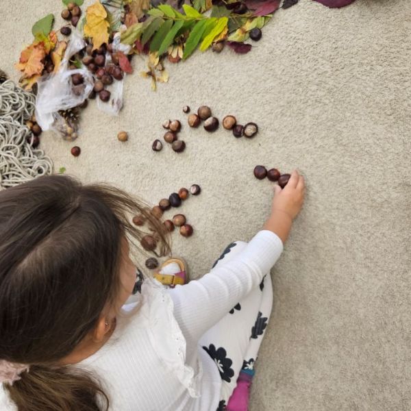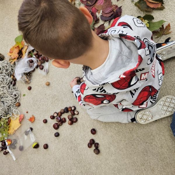 W ramach projektu „Sensoryczne pory roku z grupą Kotki” dzieci wyruszyły w pełną barw i zapachów podróż po jesiennym świecie. Podczas zajęć rozwijały zmysły dotyku, wzroku i węchu, tworząc niezwykłe kompozycje z kasztanów, liści, żołędzi i szyszek. Mali odkrywcy układali jesienne mandale, tworzyli sensoryczne ścieżki oraz wspólnie bawili się w „kasztanowe liczenie”.