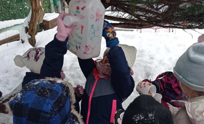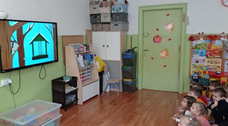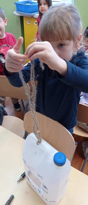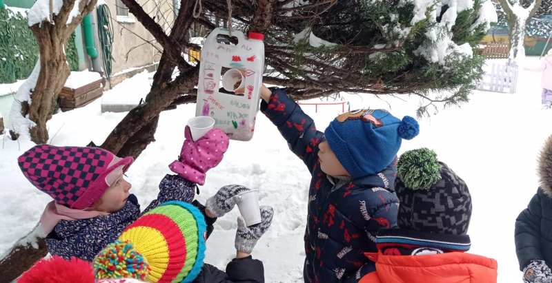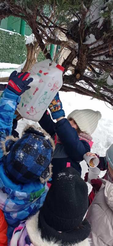 W naszym przedszkolu zawitała prawdziwa zima. Jest to trudny czas dla ptaków. W grupie VIII, dzieci po obejrzeniu filmu edukacyjnego o dokarmianiu ptaków zimą, postanowiły pomóc ptakom i wykonały karmniki z butelek. Dzieci pomalowały karmniki i napisały na nich swoje imiona. Potem poszliśmy je zawiesić w ogrodzie. Dzieci wsypały do nich mnóstwo pysznych ziarenek dla naszych ptasich przyjaciół.