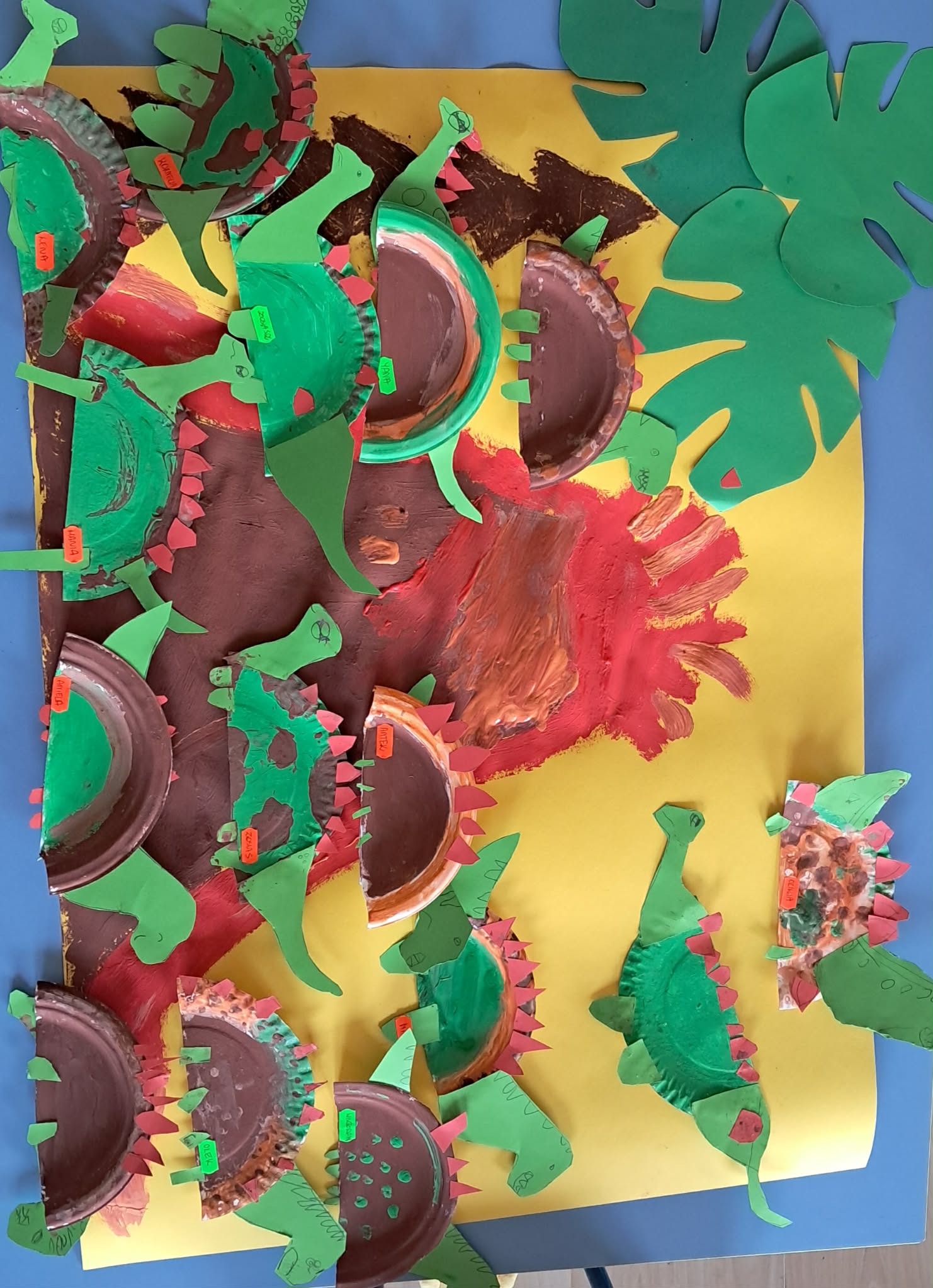 W grupie „Sowy” obchodziliśmy wyjątkowy Dzień Dinozaura. Tego dnia dzieci przeniosły się w prehistoryczny świat. Na początku obejrzeliśmy ciekawy film edukacyjny o dinozaurach, z którego dowiedzieliśmy się, jak wyglądały, czym się żywiły oraz dlaczego wyginęły. Następnie przedszkolaki z dużym zainteresowaniem przeglądały książki o dinozaurach, dzieląc się swoimi spostrzeżeniami i odkrywając nowe, trudne nazwy tych niezwykłych stworzeń. Kolejnym punktem naszego świętowania była praca plastyczna. Dzieci samodzielnie wykonały dinozaury z talerzyków papierowych. Przy pomocy farb i nożyczek powstały kolorowe, pomysłowe i niepowtarzalne prace. Każdy dinozaur był wyjątkowy i wykonany z ogromnym zaangażowaniem. To był dzień pełen radości, kreatywności i fascynujących odkryć!