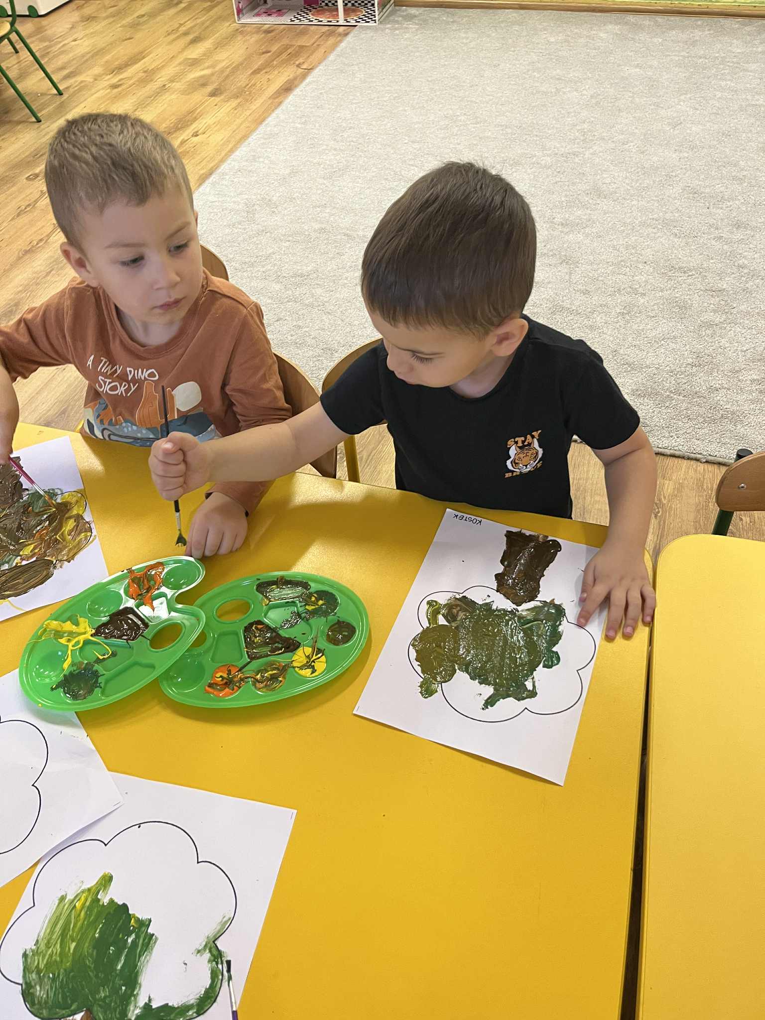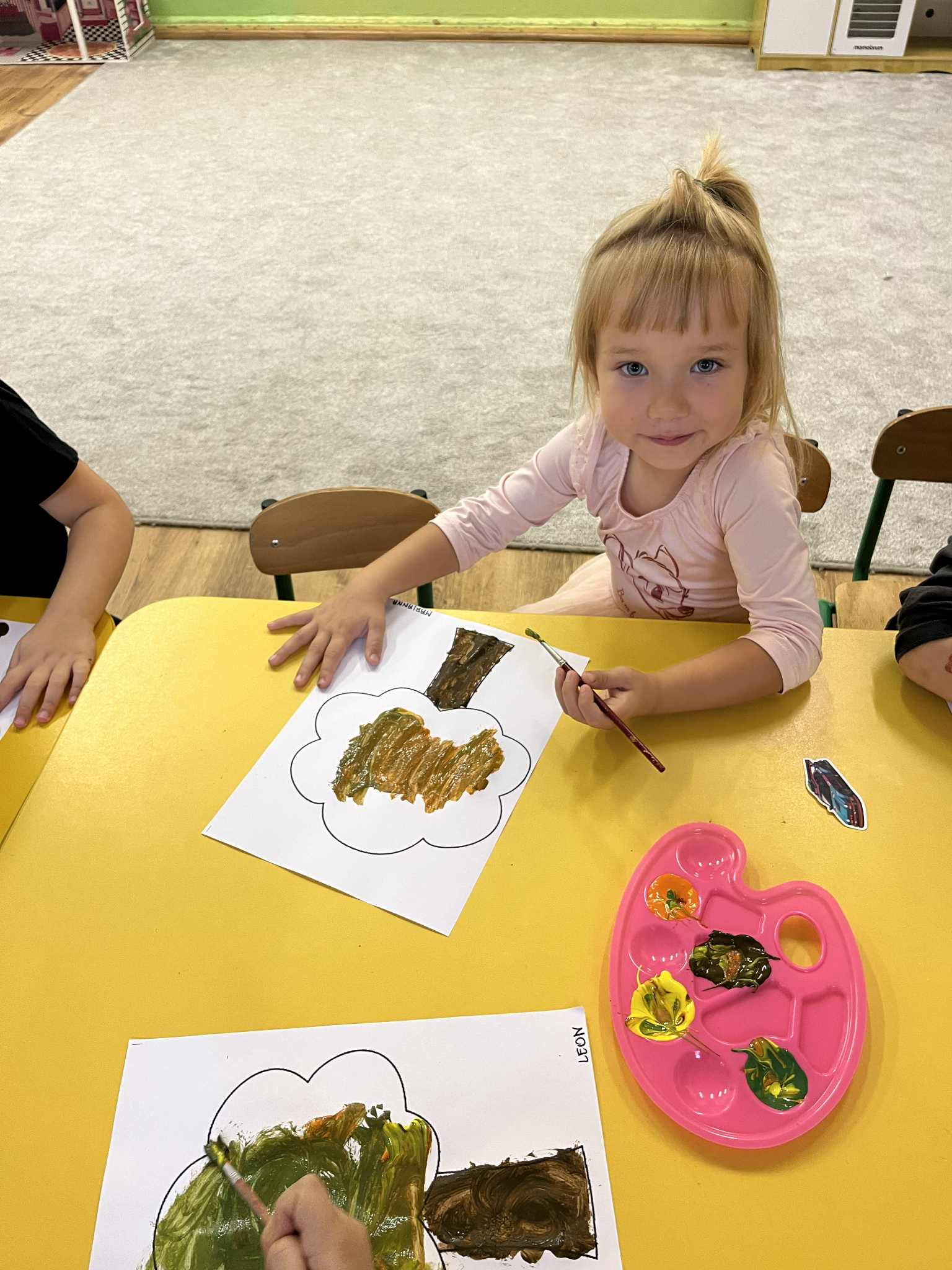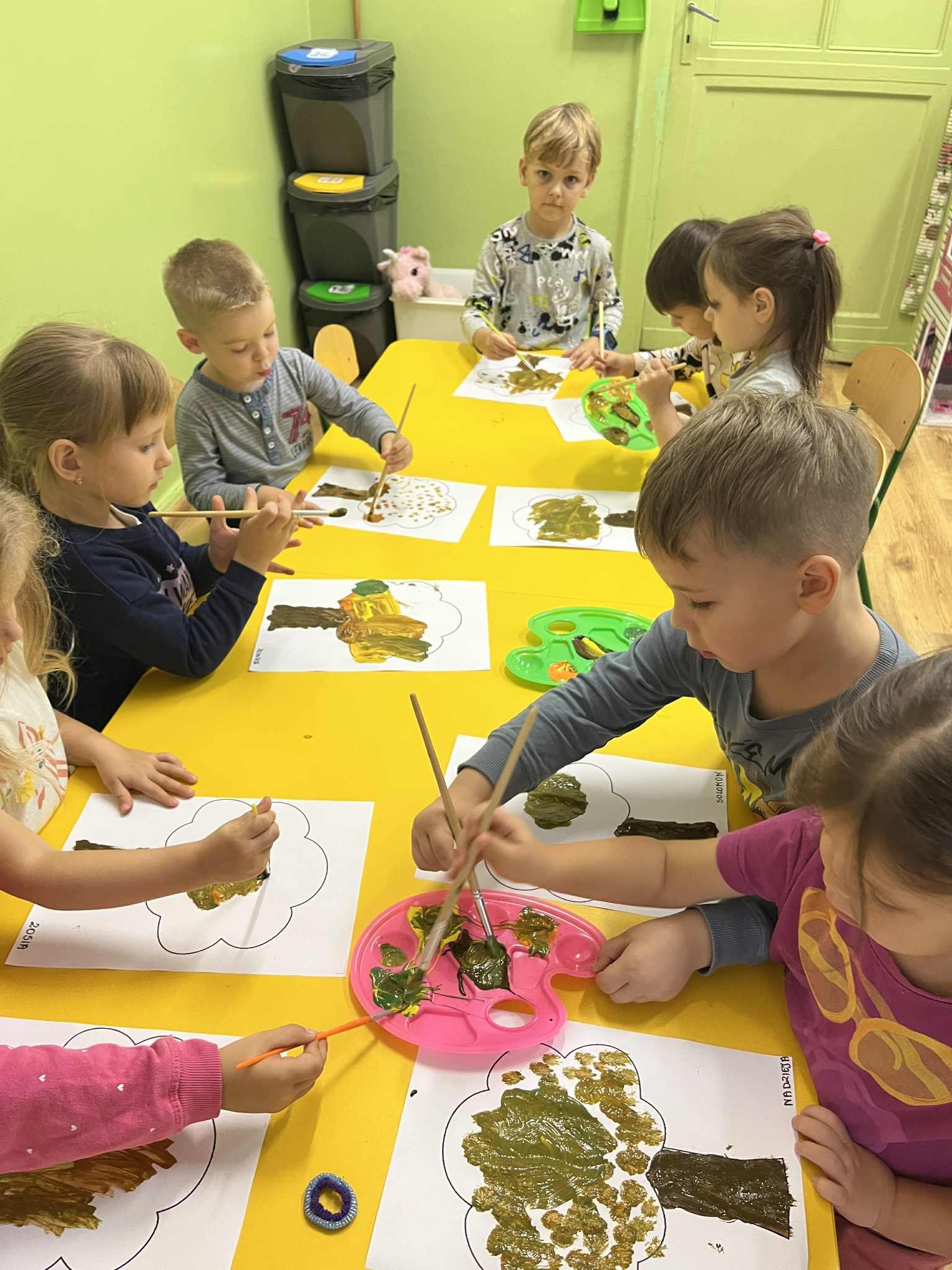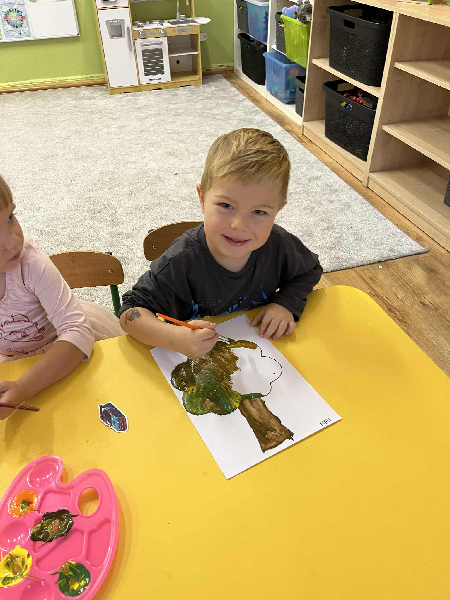 Po części poznawczej nadszedł czas na działania plastyczne. Tygryski z zapałem przystąpiły do malowania drzew farbami, tworząc kolorowe, jesienne kompozycje. Każda praca była inna – tak jak różne są drzewa w naturze.