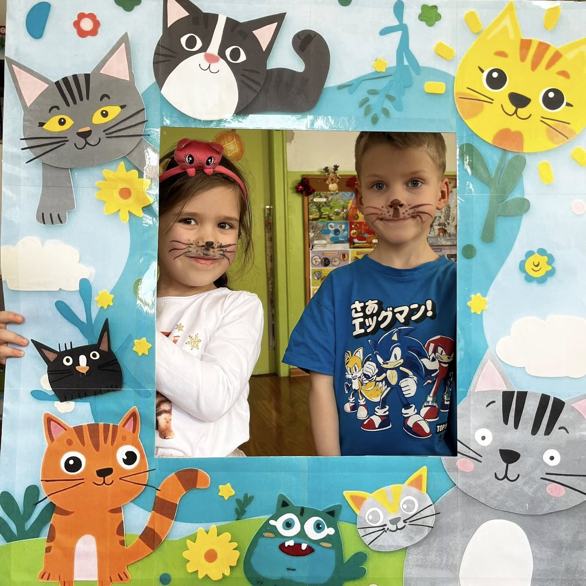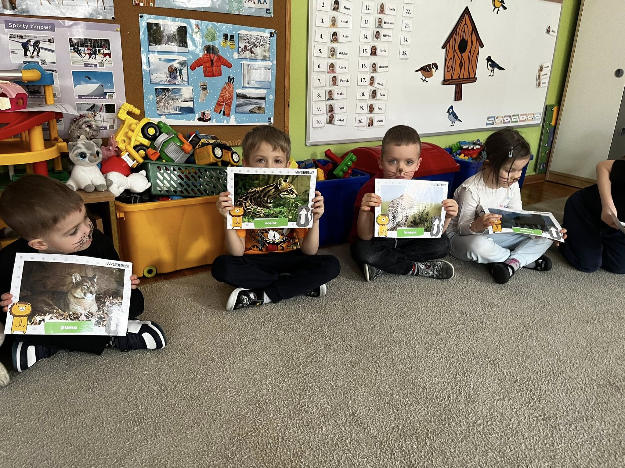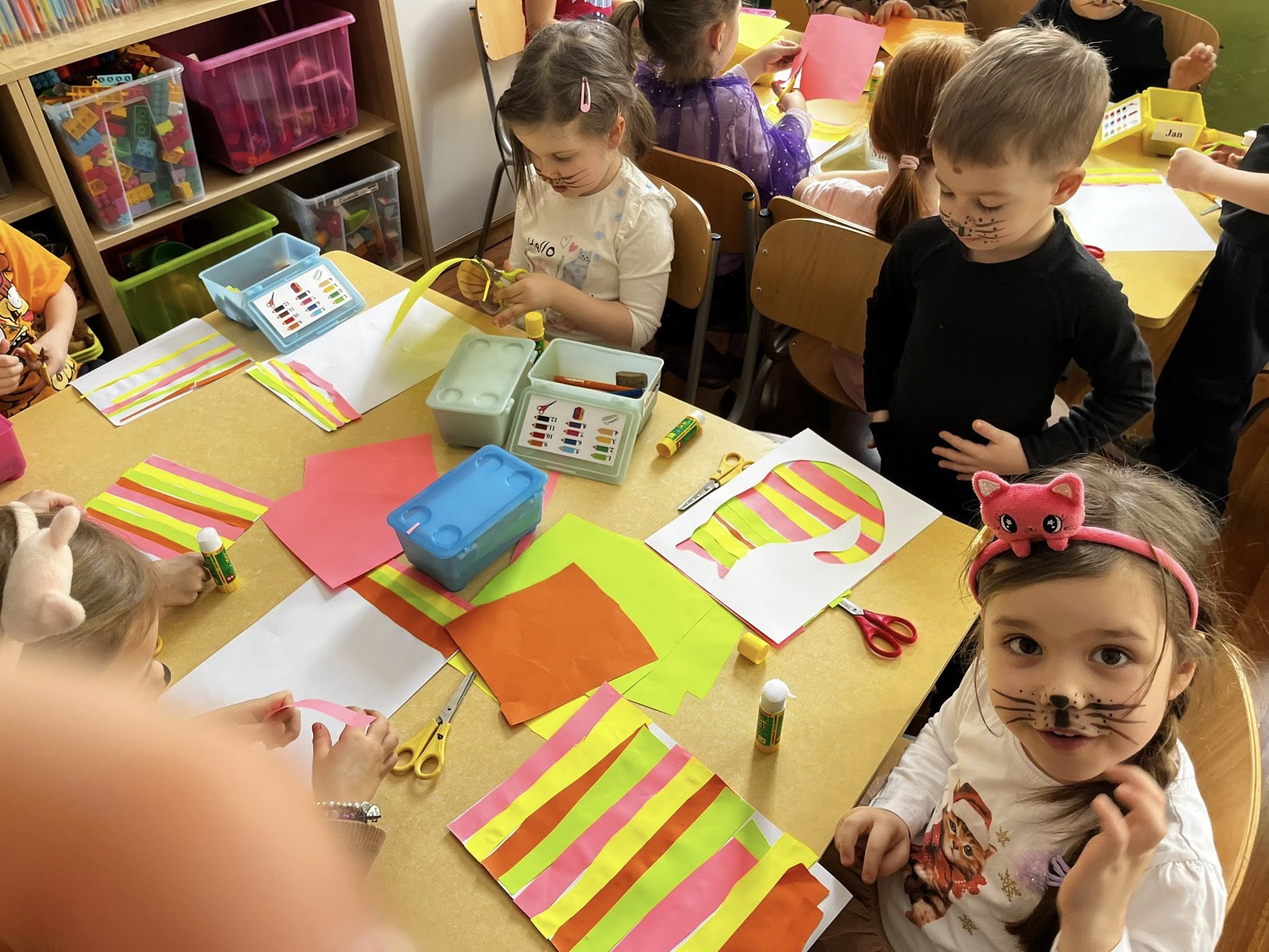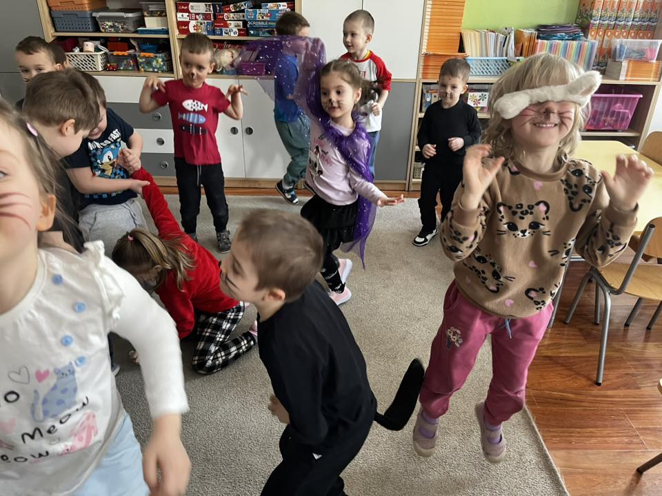 Dziś w naszej grupie świętowaliśmy Dzień Kota. Dzieci zamieniły się w małe kotki dzięki malowaniu twarzy, poznały różne gatunki dzikich kotów oraz brały udział w zabawach ruchowych „w kotka i myszkę”. Dużo radości sprawiła także zabawa z latarką – podświetlaliśmy papierowe kotki, aby sprawdzić, co kryje się w ich brzuszkach. Na zakończenie przedszkolaki wykonały pracę plastyczną – stworzyły kolorowe tła z pasków papieru i przykleiły na nich sylwetę kotka. To był dzień pełen uśmiechu i kreatywnej zabawy!