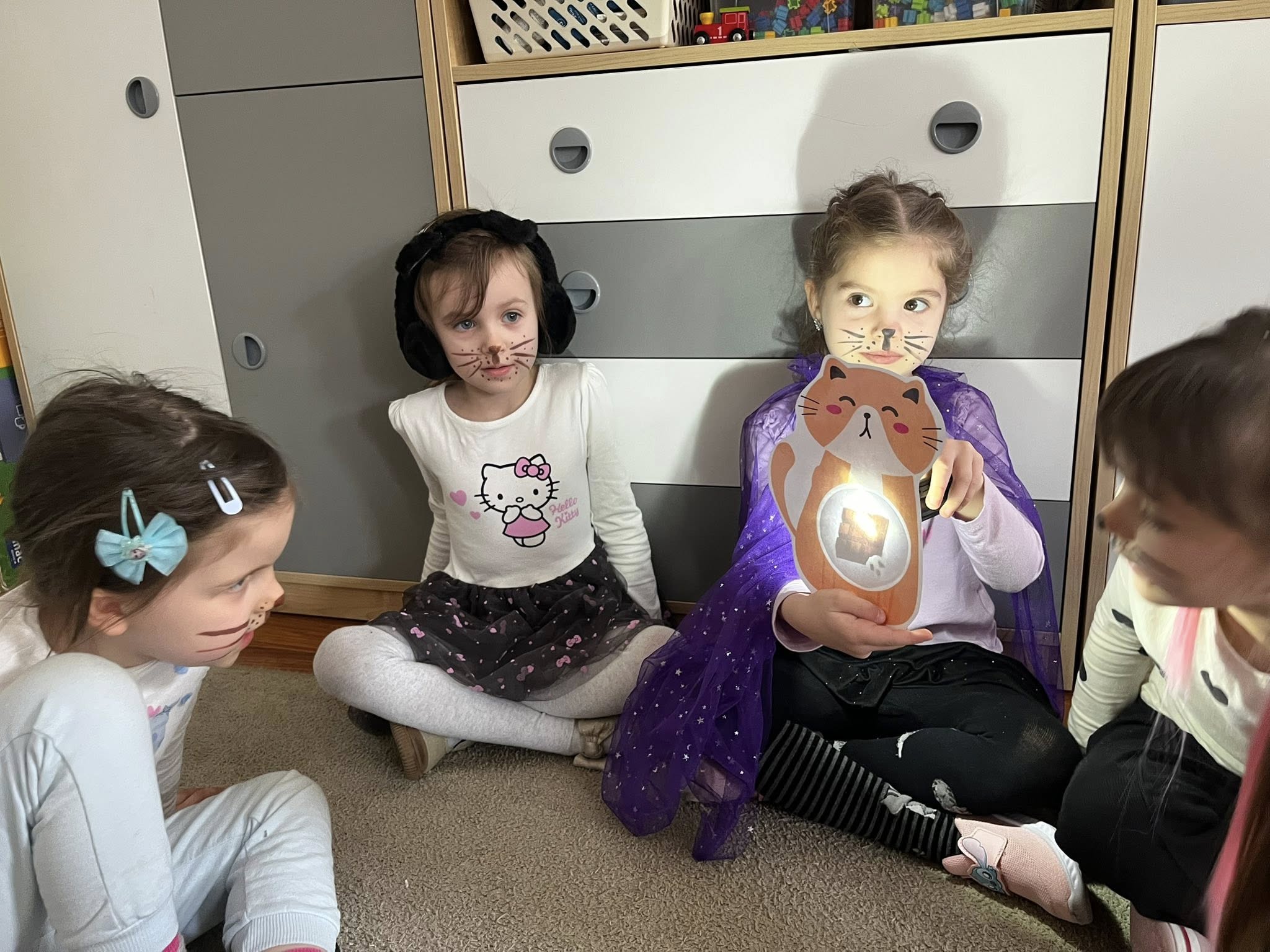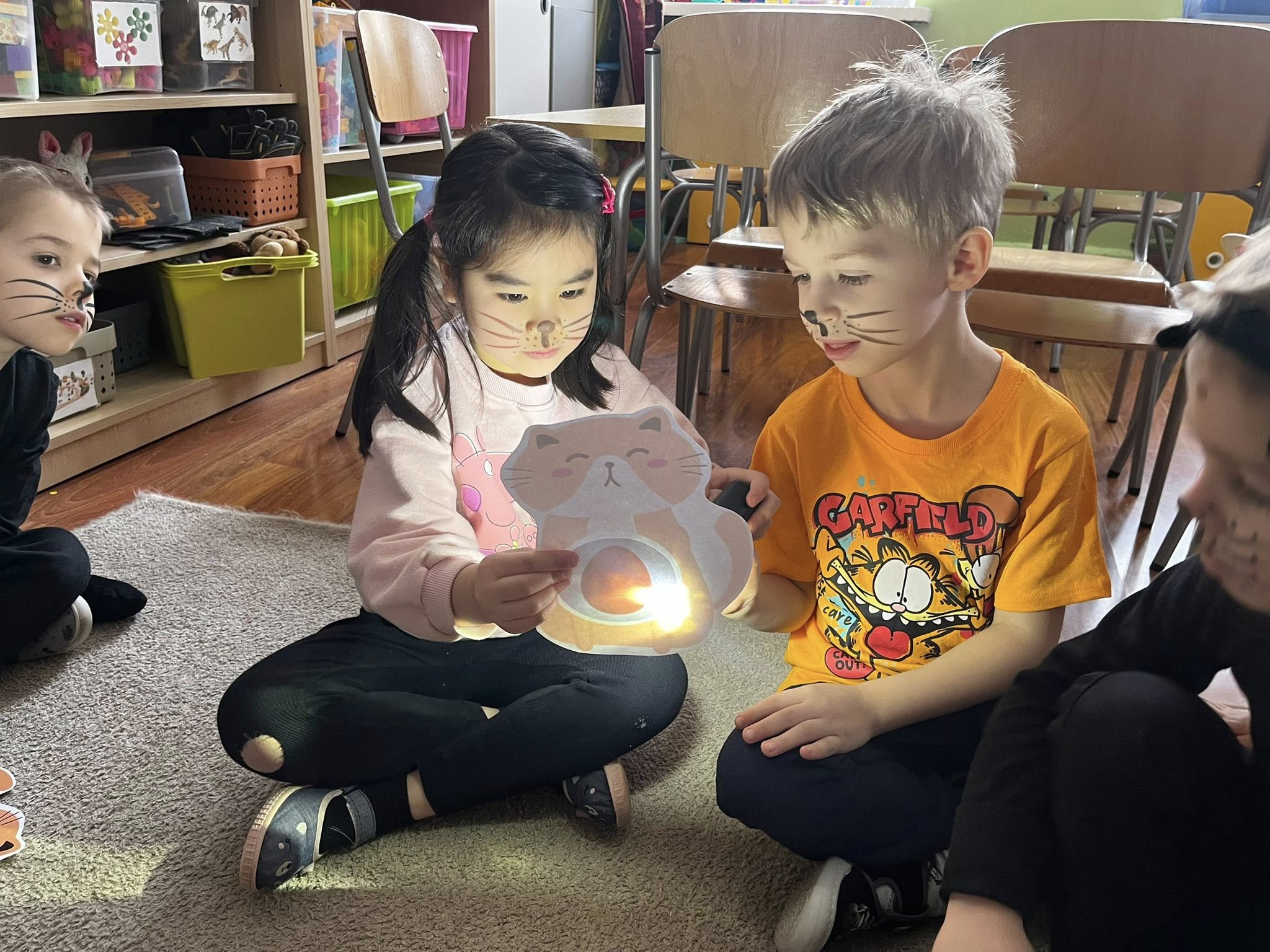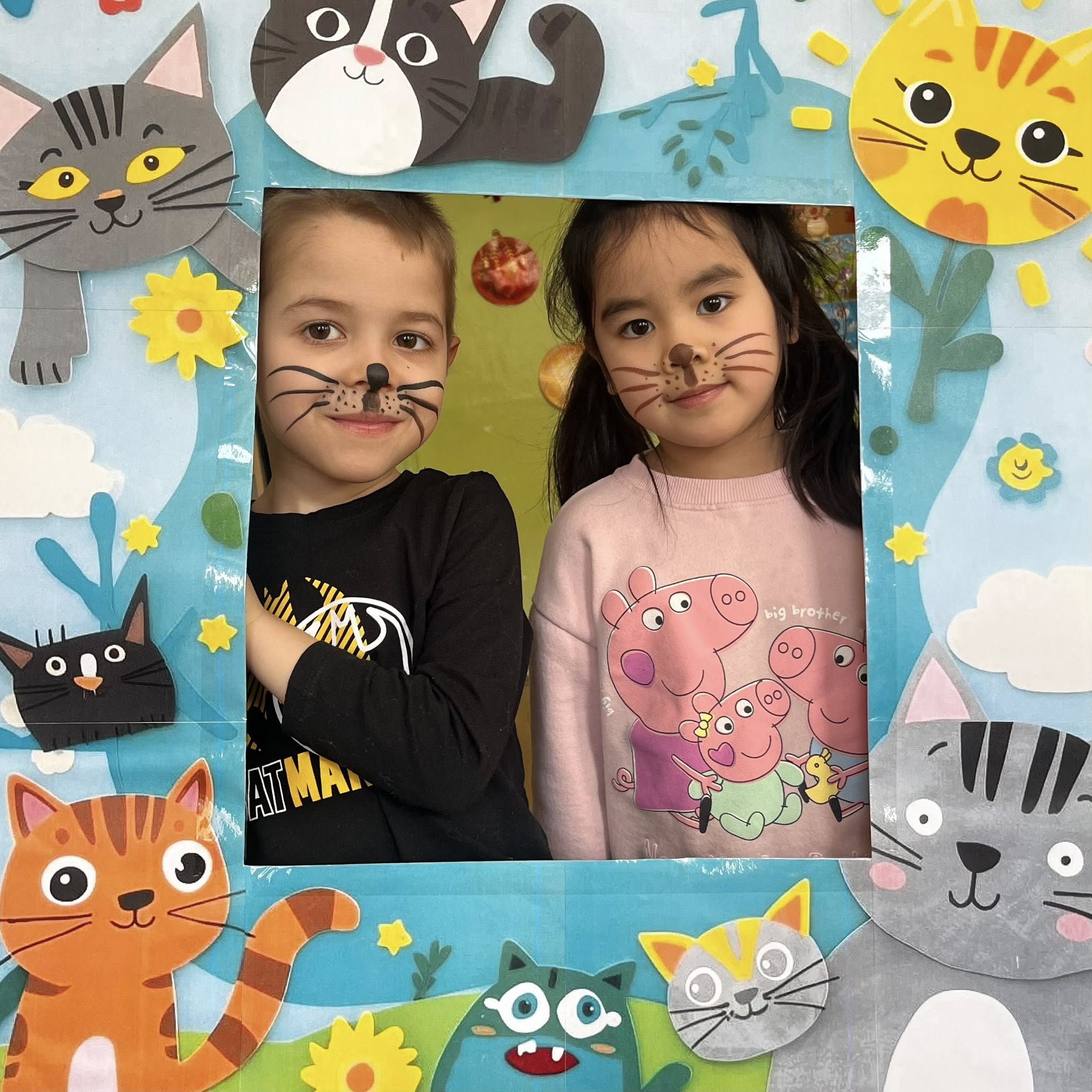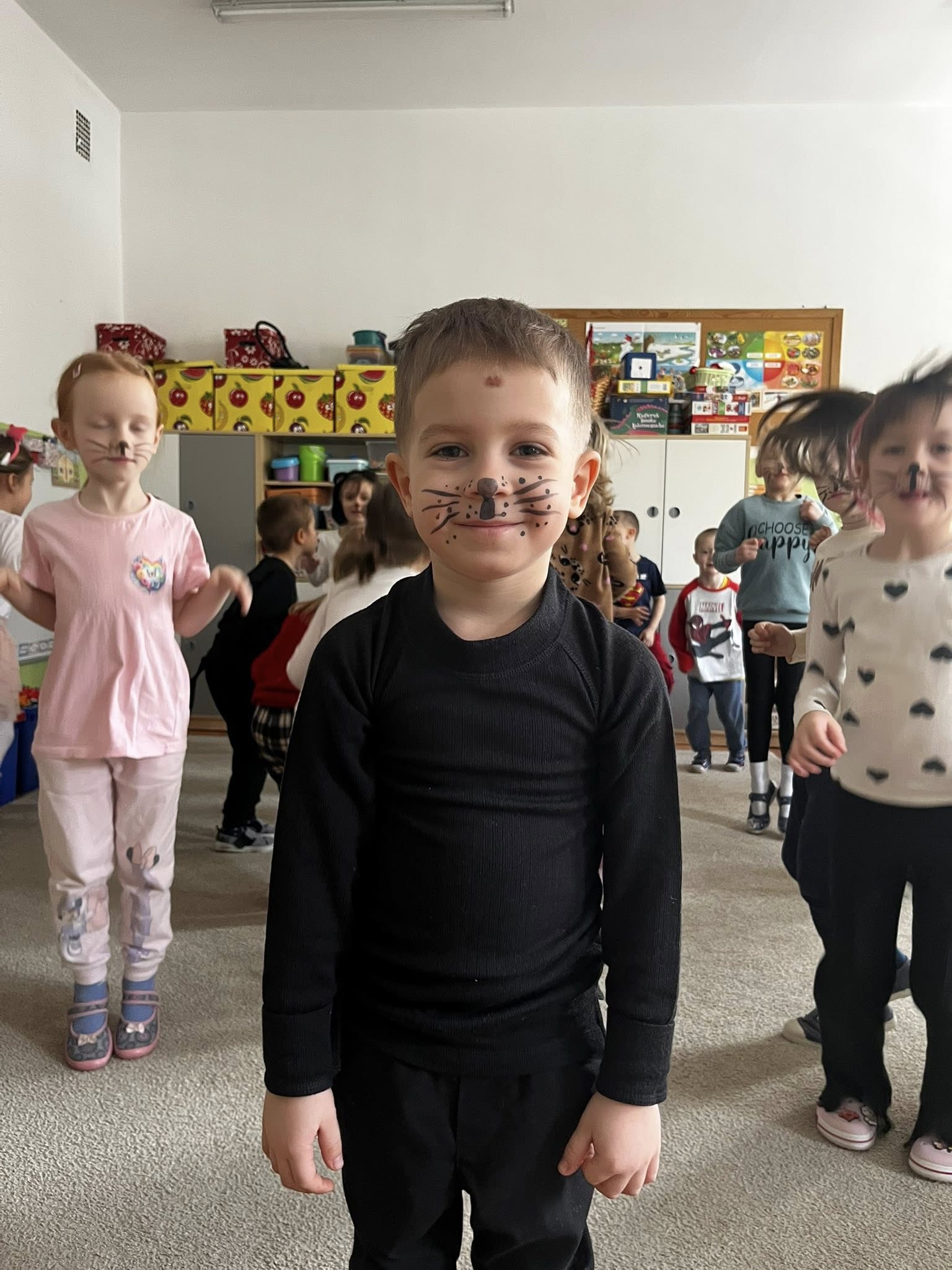 Dziś w naszej grupie świętowaliśmy Dzień Kota. Dzieci zamieniły się w małe kotki dzięki malowaniu twarzy, poznały różne gatunki dzikich kotów oraz brały udział w zabawach ruchowych „w kotka i myszkę”. Dużo radości sprawiła także zabawa z latarką – podświetlaliśmy papierowe kotki, aby sprawdzić, co kryje się w ich brzuszkach. Na zakończenie przedszkolaki wykonały pracę plastyczną – stworzyły kolorowe tła z pasków papieru i przykleiły na nich sylwetę kotka. To był dzień pełen uśmiechu i kreatywnej zabawy!