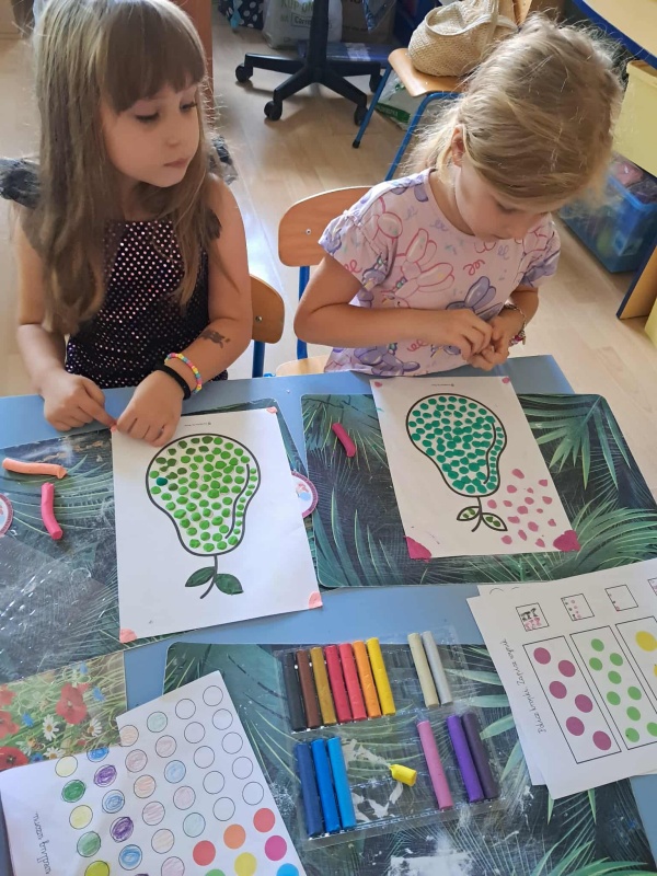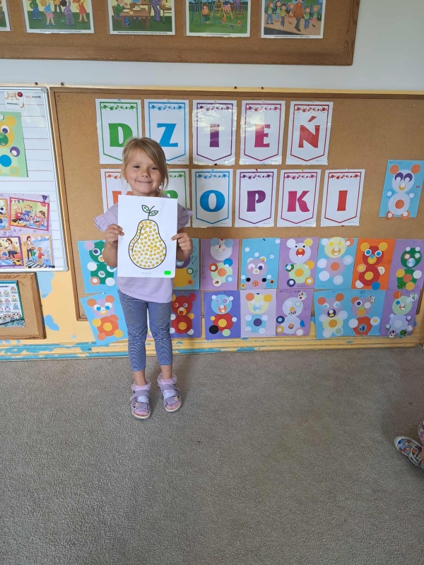 Z tej okazji dzieci z grupy „Sowy” uczestniczyły w wielu ciekawych i „kropkowych” zabawach. Na początek przedszkolaki wyklejały plasteliną gruszki - każda praca była wyjątkowa i kolorowa!