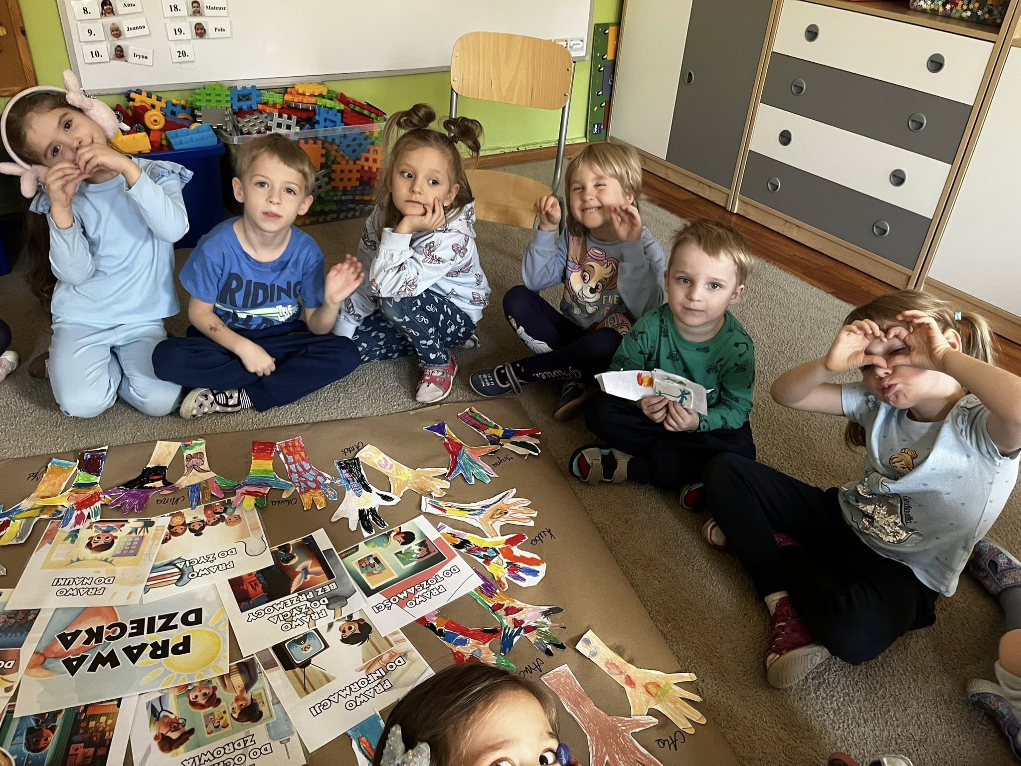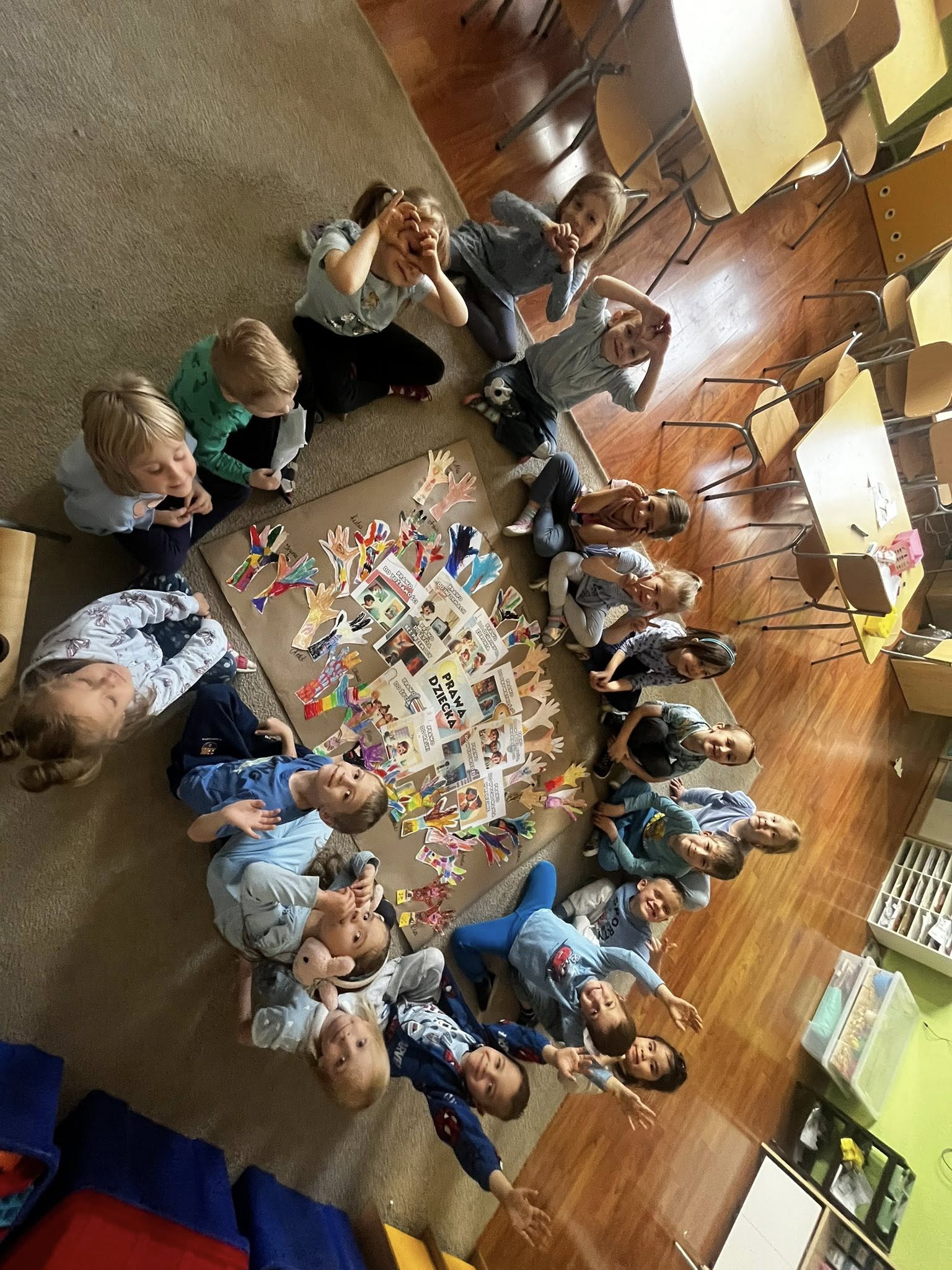 Następnie stworzyliśmy plakat z najważniejszymi prawami dziecka. Każde dziecko ozdobiło własną papierową dłoń, która stała się symbolem jego wyjątkowości i niezbywalnych praw. Kolorowe dłonie połączyliśmy w radosną kompozycję, która będzie nam przypominać o tym ważnym dniu.