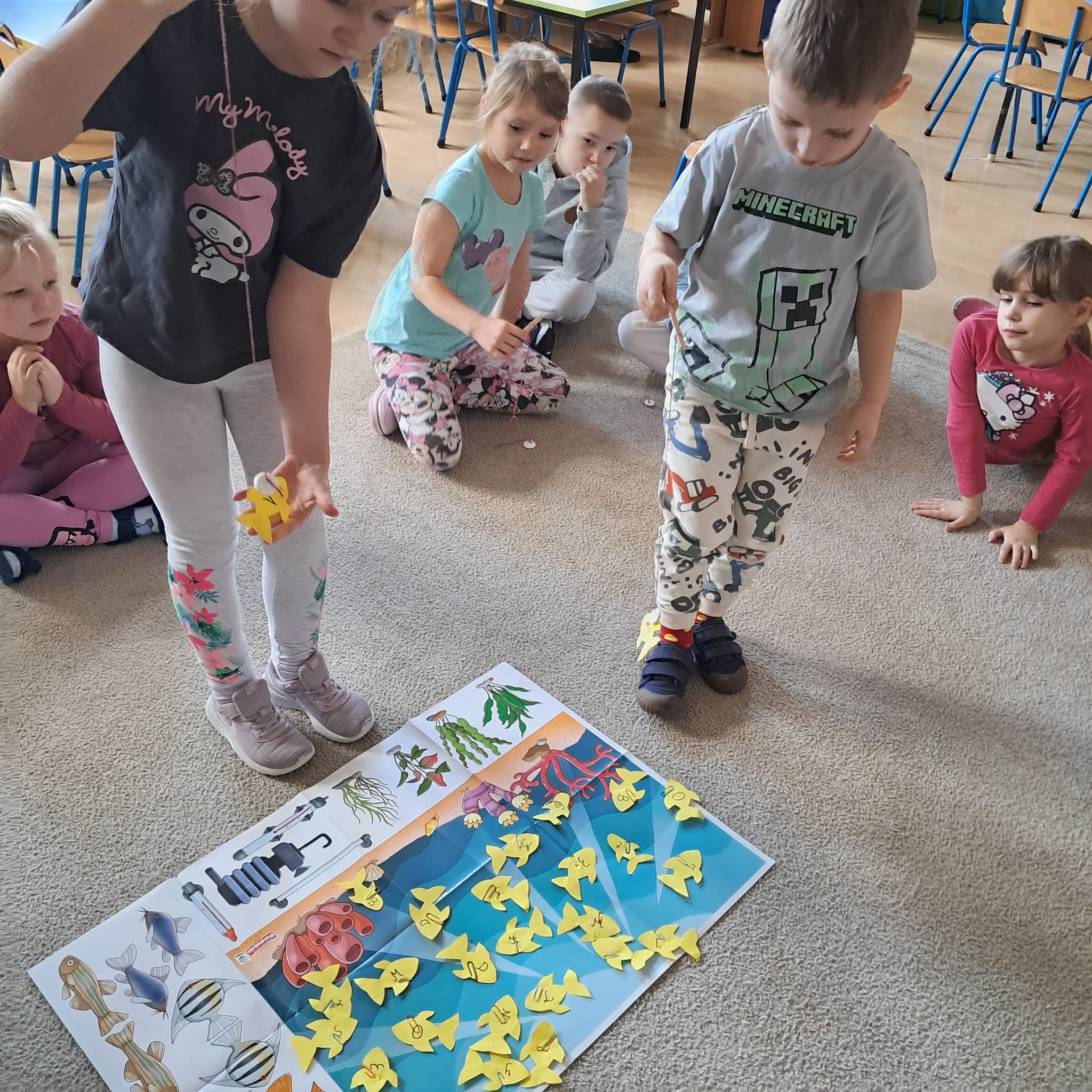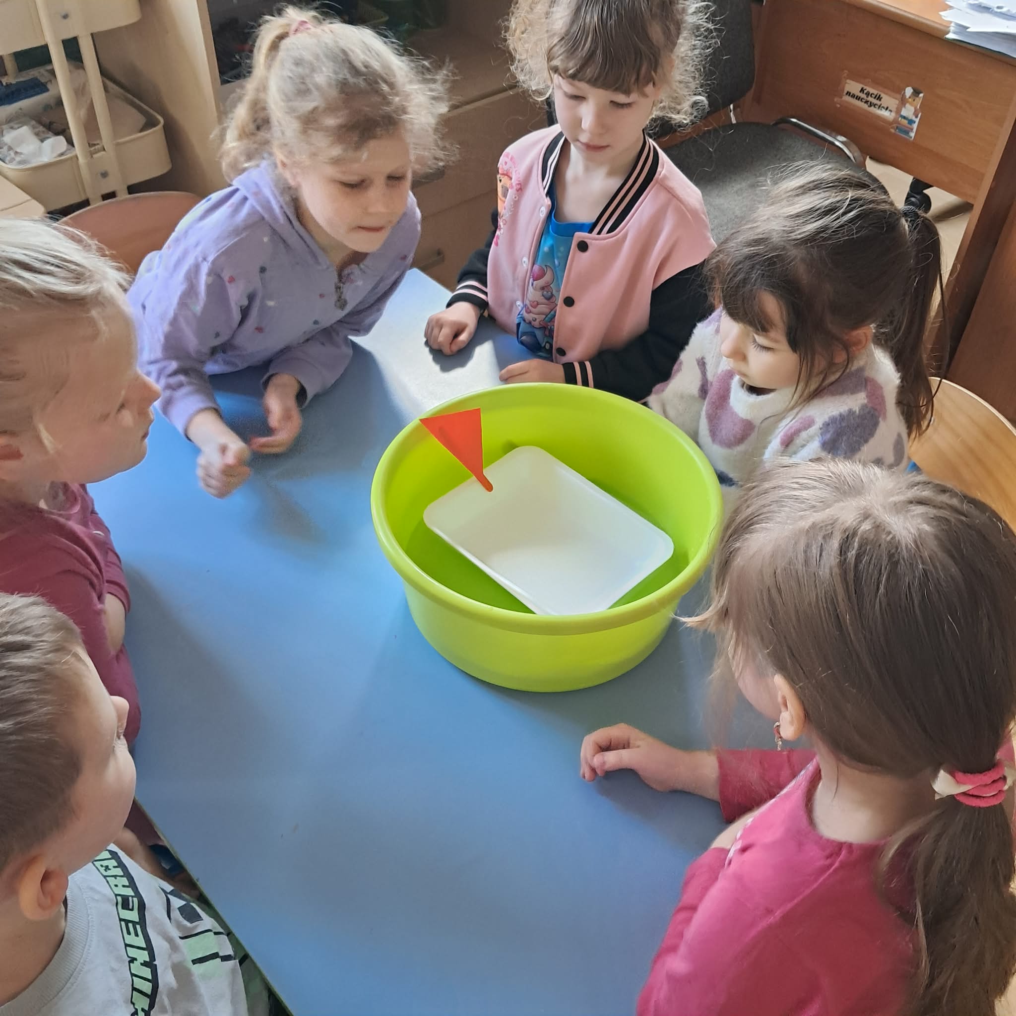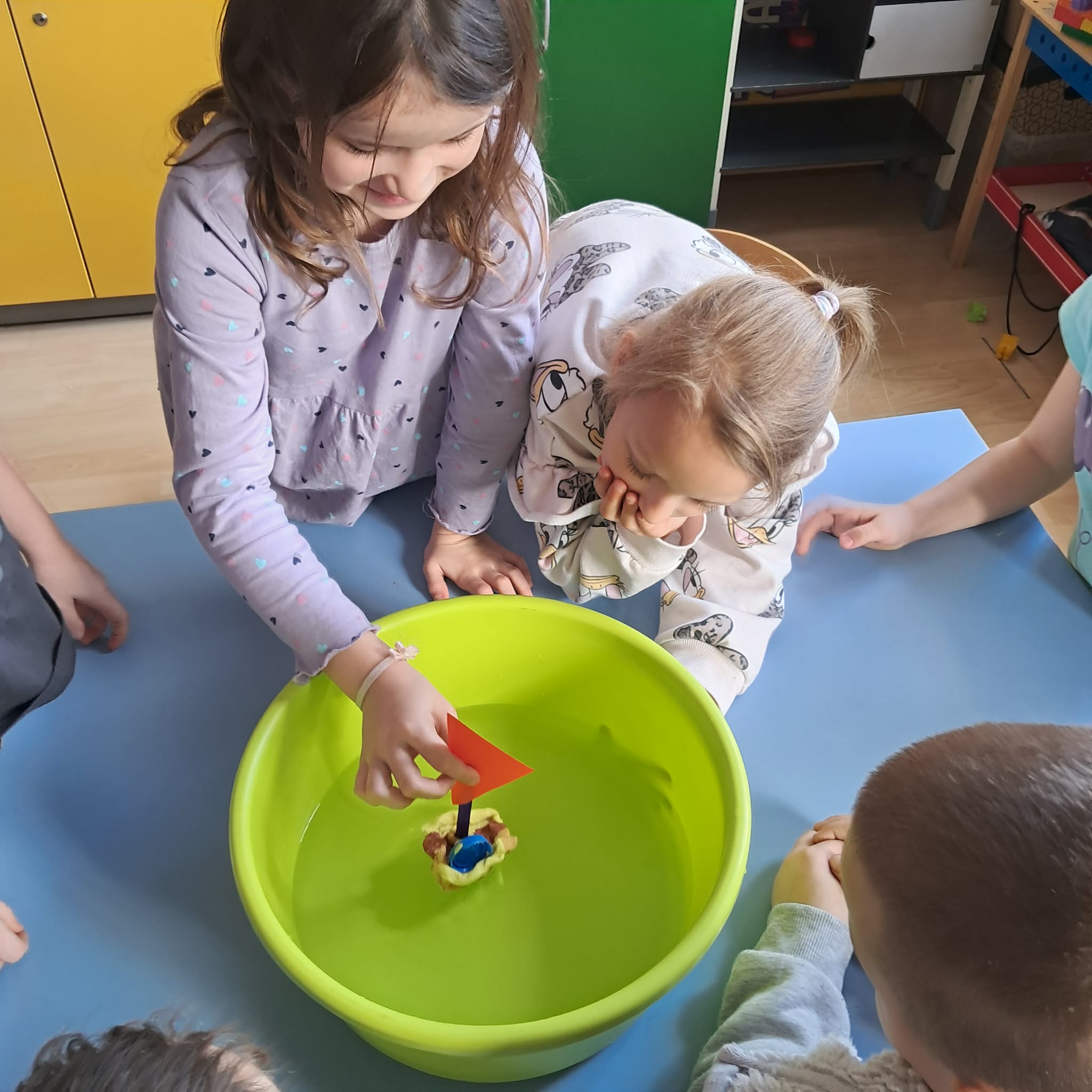 W naszej grupie „Sowy” odbyły się wyjątkowe zajęcia. Dzieci miały okazję wcielić się w rolę małych odkrywców i naukowców, wykonując ciekawe, dziecięce eksperymenty. Pierwszą atrakcją było łowienie ryb na wędkę z magnesem. Dzieci łowiły kolorowe rybki, na których znajdowały się poznane już literki. Dzięki temu utrwalaliśmy znajomość liter, a jednocześnie poznawaliśmy właściwości magnesu. Radości i emocji było co niemiara, gdy każdemu udało się „złowić” swoją rybkę! Kolejnym zadaniem było konstruowanie pływających statków. Wykorzystaliśmy do tego nakrętki, styropian oraz modelinę. Dzieci z dużym zaangażowaniem tworzyły swoje konstrukcje, a następnie sprawdzaliśmy, który statek będzie pływał, a który zatonie. Była to doskonała okazja do obserwacji, wyciągania wniosków oraz rozmowy o tym, dlaczego jedne przedmioty unoszą się na wodzie, a inne toną. To był dzień pełen nauki poprzez zabawę, współpracy oraz wspaniałych doświadczeń, który na długo pozostanie w pamięci naszych „Sówek”.