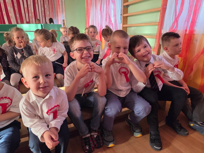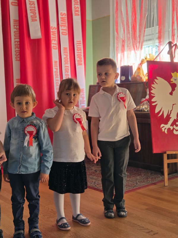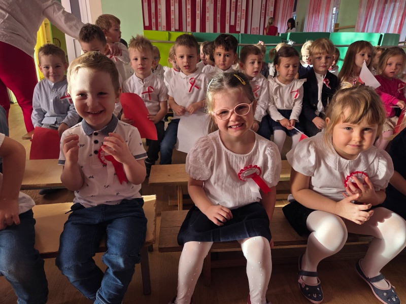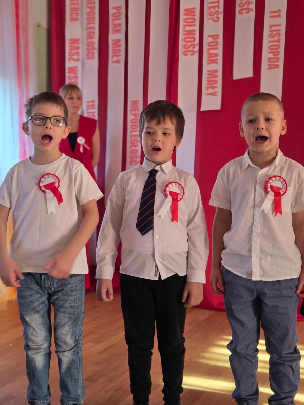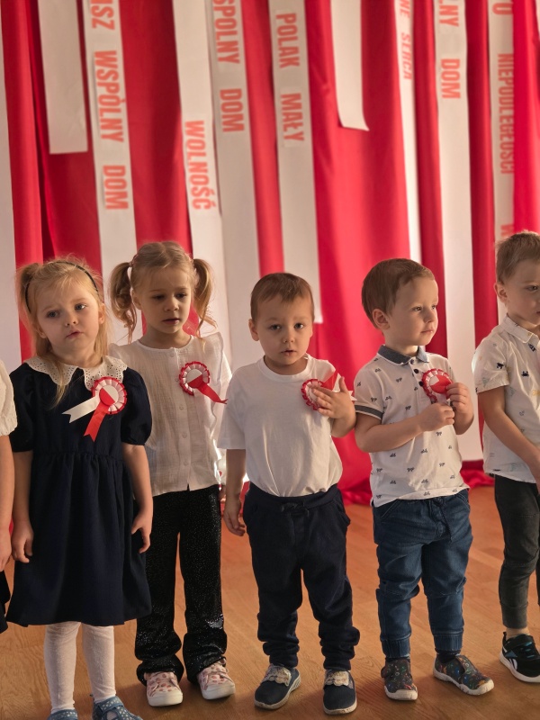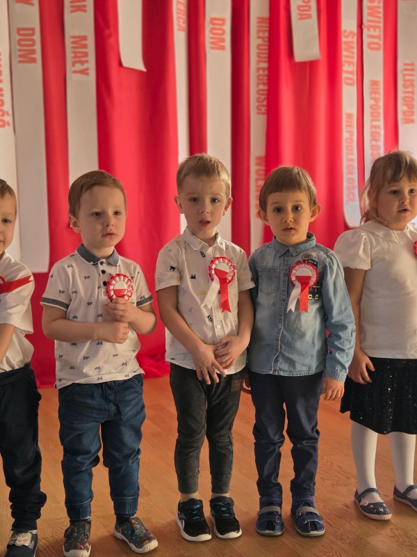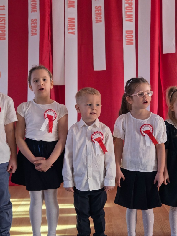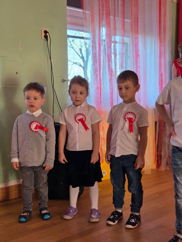 Grupa „Nutki” z dumą zaśpiewała piosenkę patriotyczną, wprowadzając wszystkich w uroczysty nastrój. Dzieci zaprezentowały się wspaniale - śpiewając z zaangażowaniem i radością, a ich występ został nagrodzony gromkimi brawami. To był piękny i pełen emocji moment, z którego jesteśmy bardzo dumni.