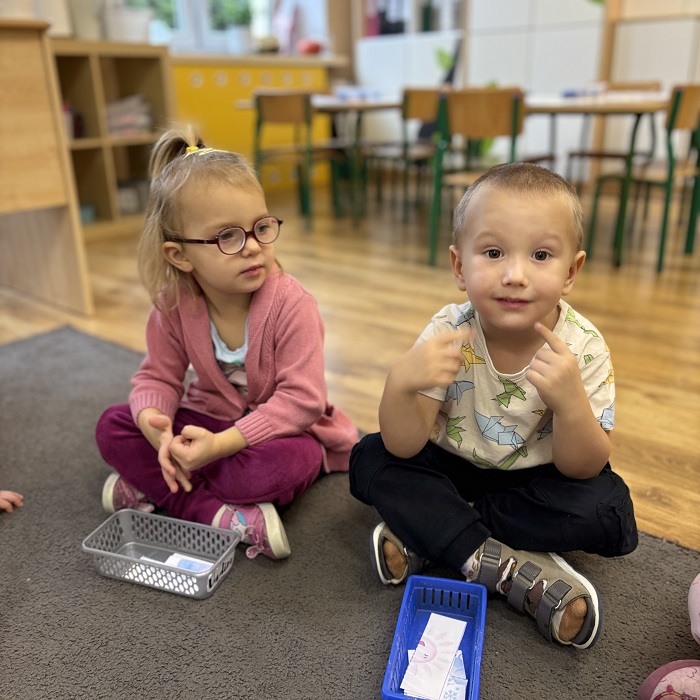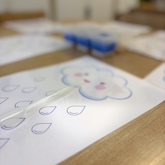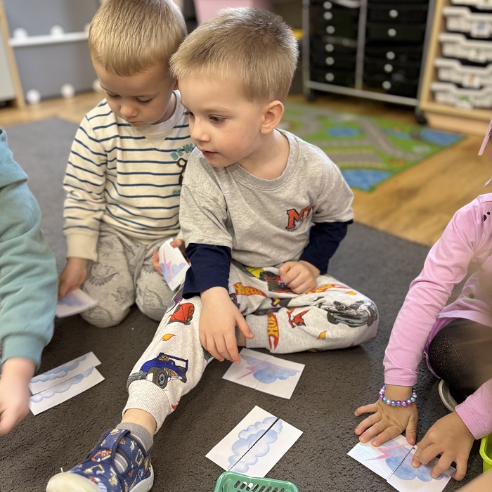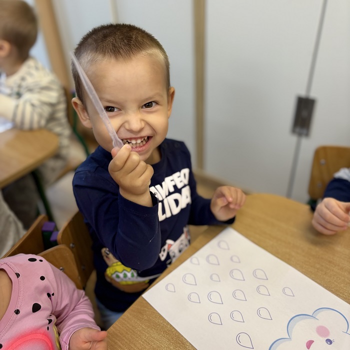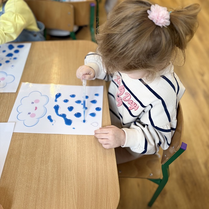 Cytrynki dowiedziały się skąd bierze się deszcz, jak krąży woda w przyrodzie. Obejrzeliśmy film edukacyjny „Jak kropelka wody wędrowała przez świat”, układaliśmy puzzle z chmurek i słońca oraz umieszczaliśmy krople wody pod chmurką przy użyciu barwnika i pipety.