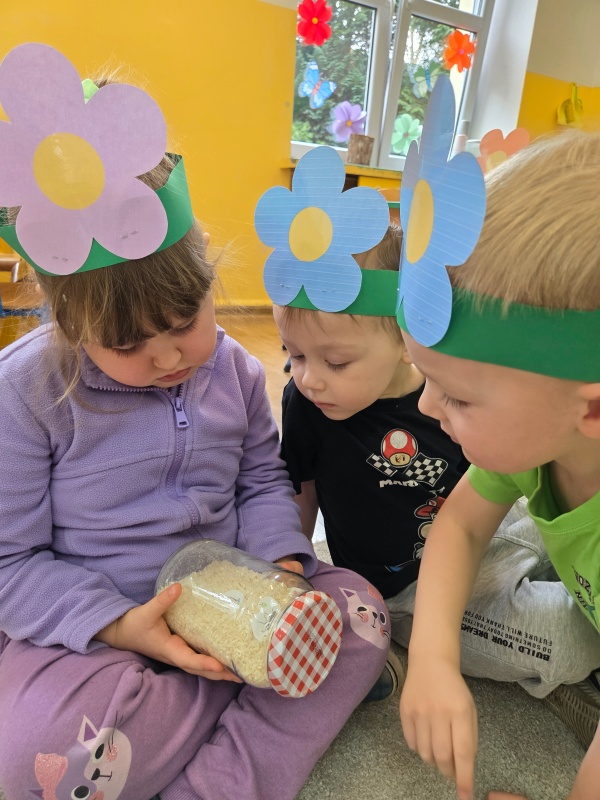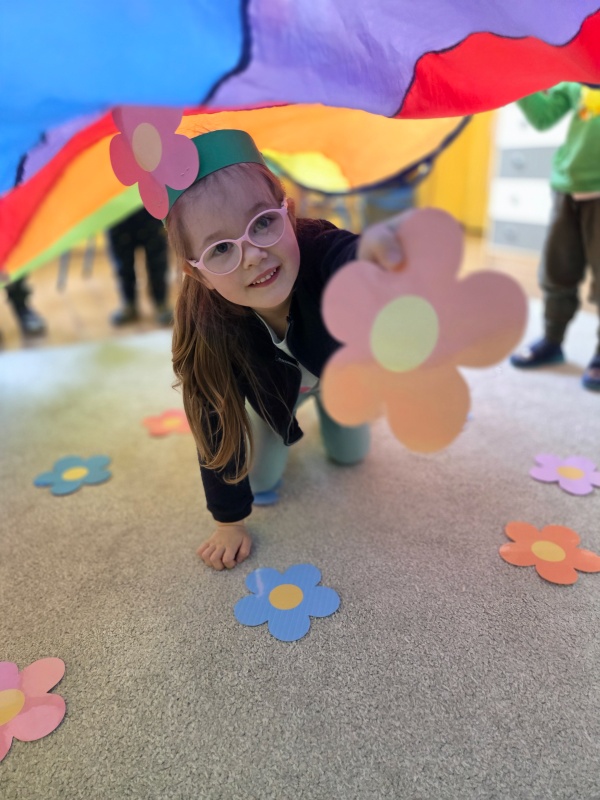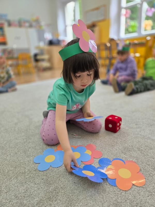 Dzieci z ogromnym zaangażowaniem rozwiązywały wiosenne zagadki, szukały kolorowych kwiatów ukrytych pod chustą animacyjną oraz odkrywały, jakie owady obudziły się już po zimowym śnie. Układały także wiosenne puzzle, rozwijając spostrzegawczość i koncentrację. Nie zabrakło też zabaw matematycznych. Przedszkolaki rzucały kostką, przeliczały kropki i dopasowywały odpowiednią liczbę kolorowych kwiatów do nutkowego ogródka.