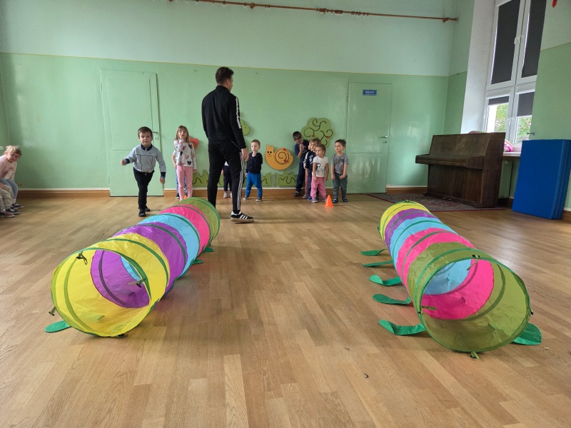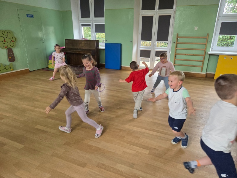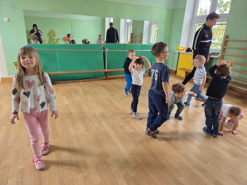 Dzieci z wielkim entuzjazmem uczestniczyły w różnorodnych zabawach ruchowych, grach i wyścigach rzędów. Zajęcia dostarczyły mnóstwo radości i pozytywnej energii, a jednocześnie wspierały rozwój sprawności, koordynacji oraz współpracy w grupie.