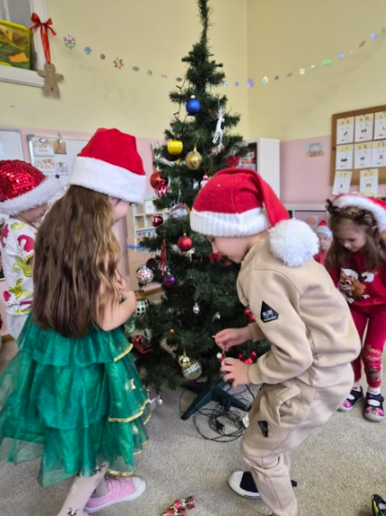 Dzieci z grupy „Kotki” z radością uczestniczyły w ubieraniu choinki. Wspólne dekorowanie wprowadziło świąteczną atmosferę oraz było okazją do rozwijania współpracy i sprawności manualnej. Dzieci chętnie wybierały ozdoby i z dumą podziwiały efekt wspólnej pracy.