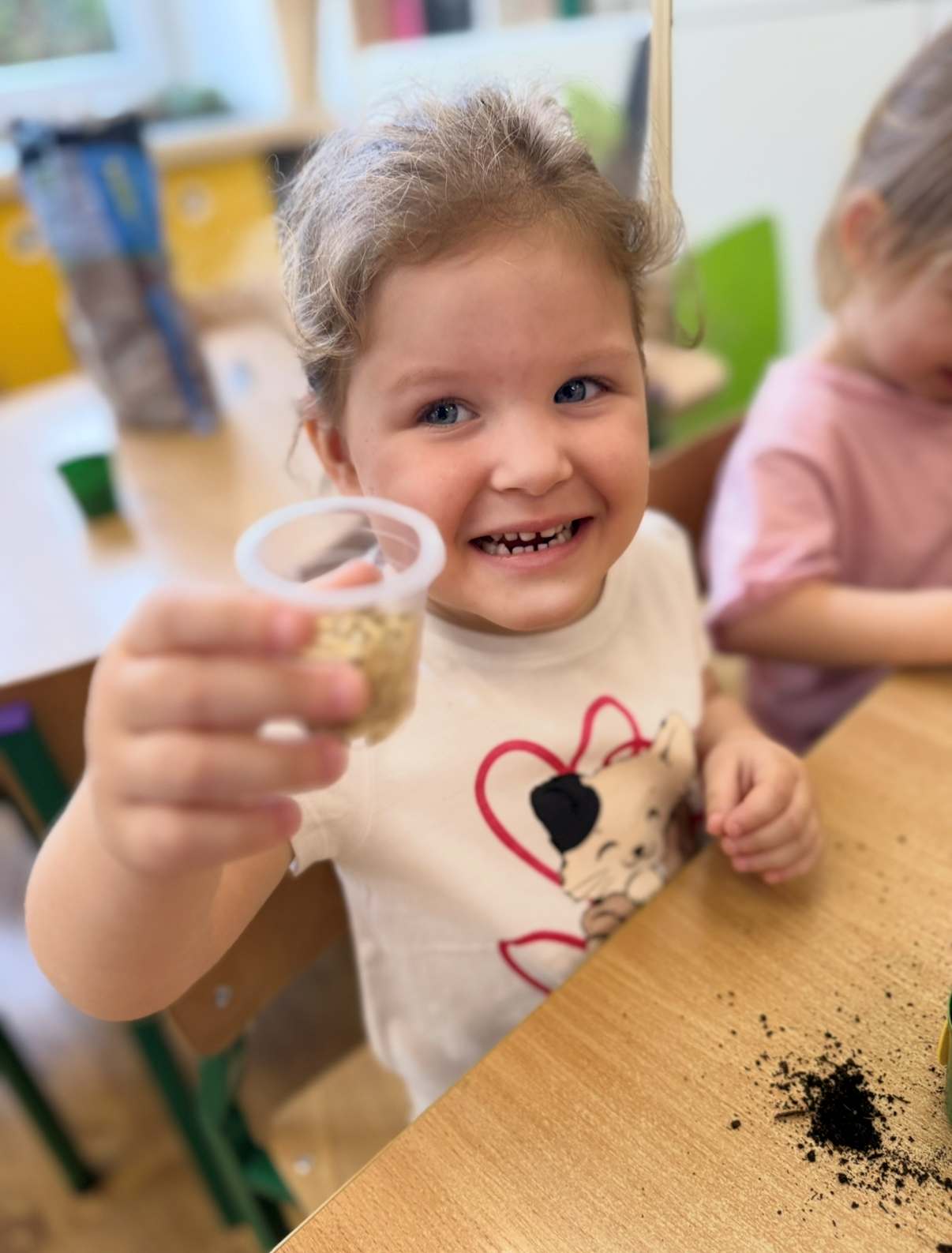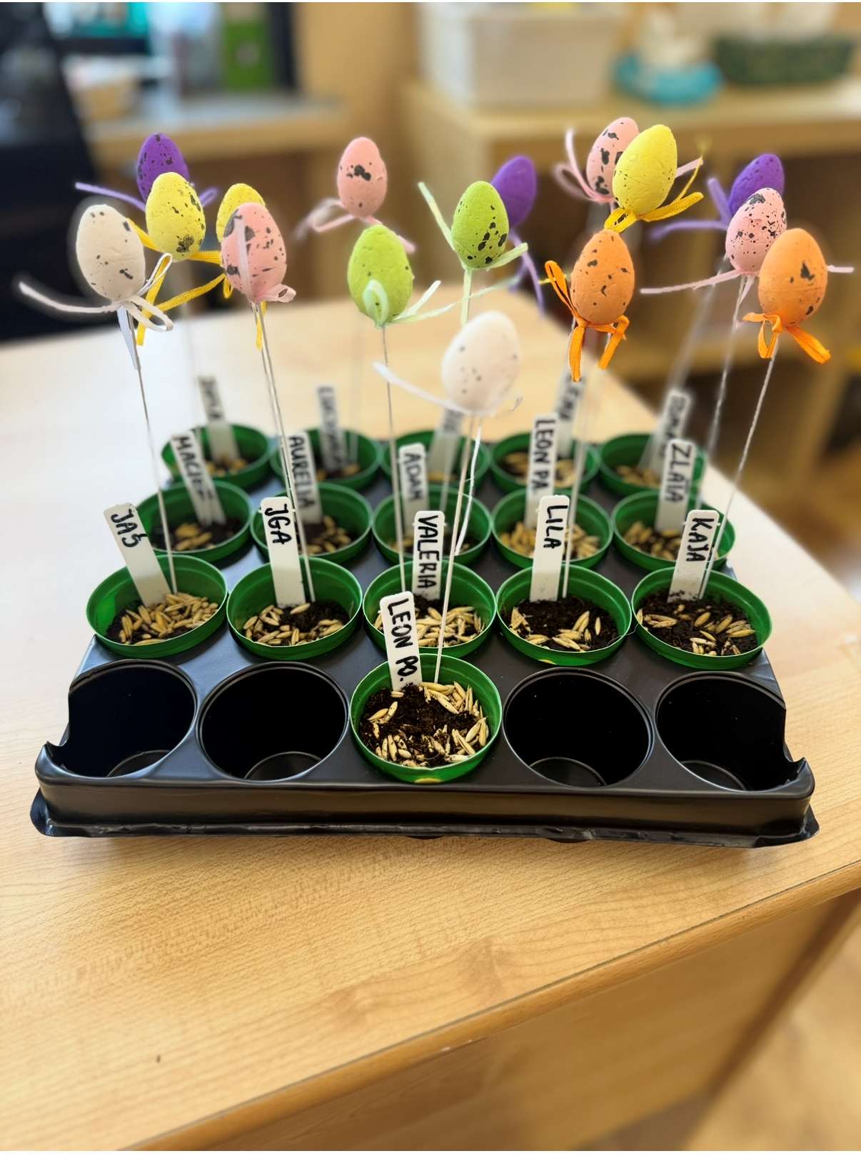 Cytrynki miały możliwość sadzić owies w przedszkolu. Każdy przedszkolak dostał swoją doniczkę z podpisanym swoim imieniem na etykiecie. Następnie dzieci wzięły łyżki w dłoń i zaczęli sypać ziemie do doniczek. Potem każdy wsypał ziarenka owsa i podlał swoją uprawę. Każdą doniczkę udekorowaliśmy wielkanocnymi jajeczkami i tak powstałe uprawy dzieci zabrały do swoich domów, by móc się nimi opiekować razem z rodzicami.