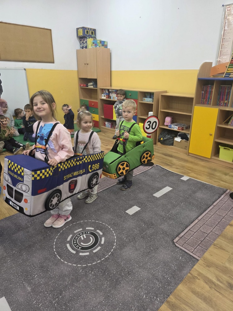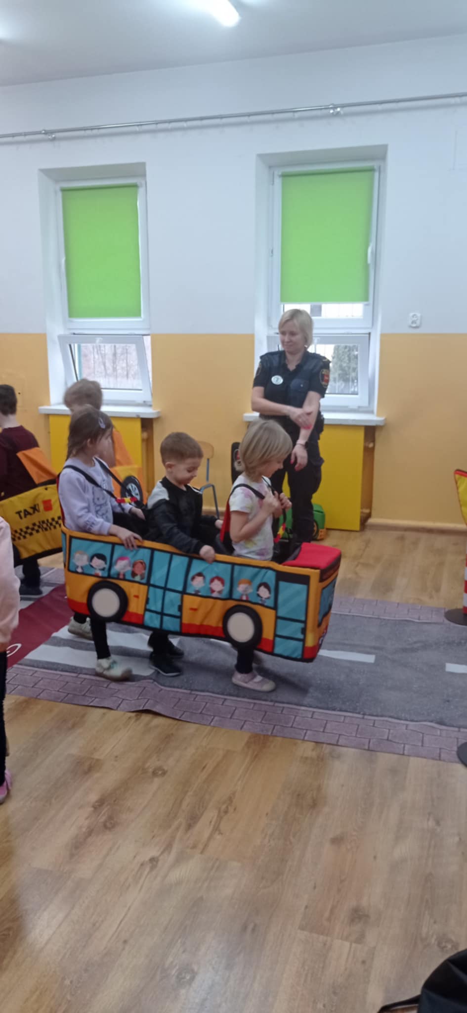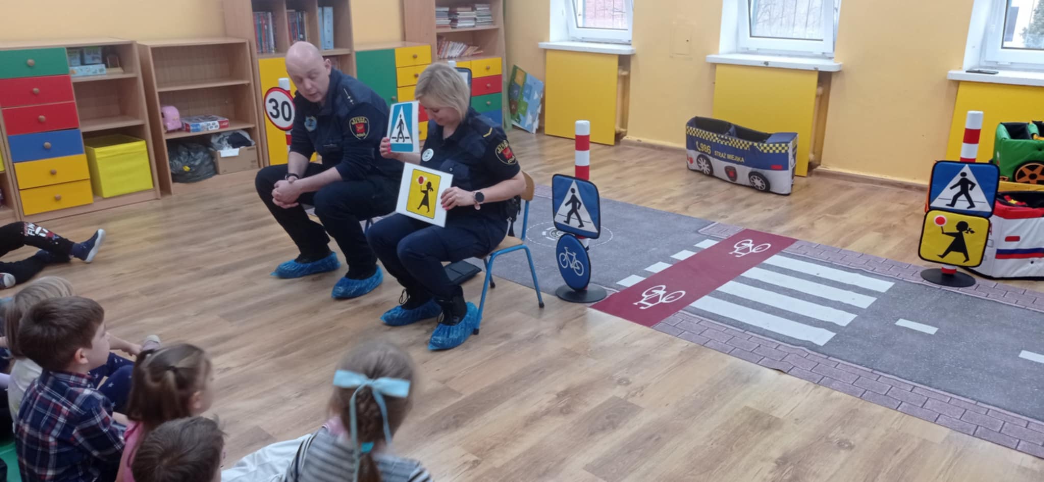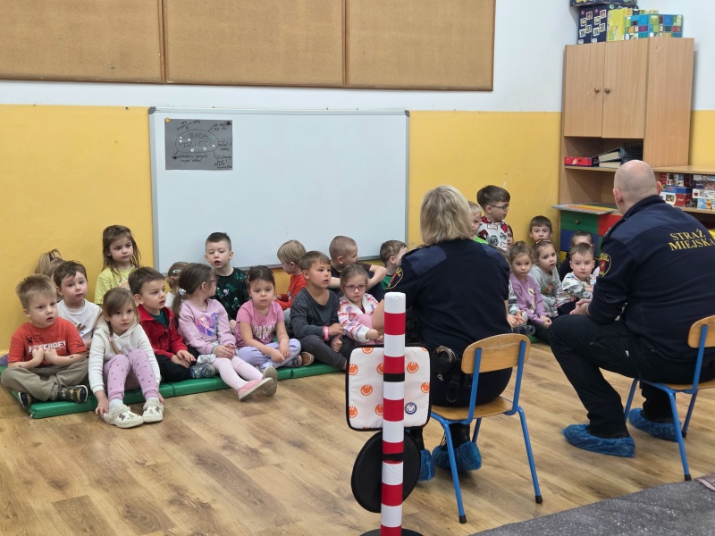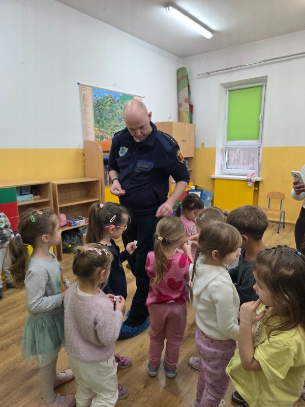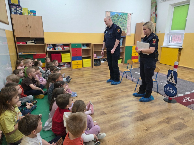 Grupy Nutki, Tygrysy, Koty oraz Motyle z ogromnym zainteresowaniem uczestniczyły w rozmowie z funkcjonariuszami. Dzieci dowiedziały się, jak bezpiecznie przechodzić przez ulicę, jak reagować w sytuacjach zagrożenia oraz do kogo zwrócić się o pomoc.