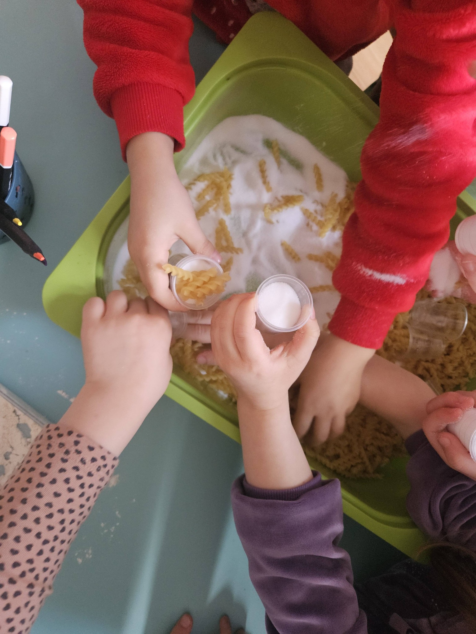 Dziś w grupie Kotki odbyły się zajęcia sensoryczne, które dostarczyły dzieciom wiele radości i ciekawych doświadczeń. Podczas zabawy wykorzystaliśmy makaron, mąkę oraz sól – produkty, które choć na co dzień kojarzą się z kuchnią, okazały się świetnym materiałem do twórczej i rozwijającej aktywności.