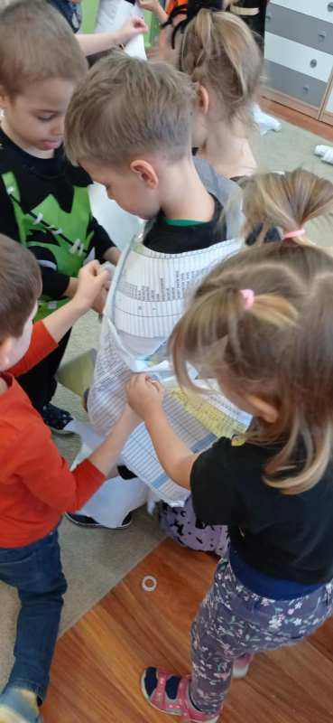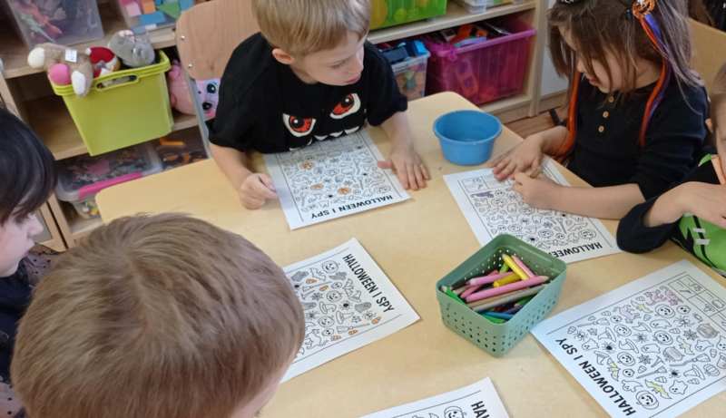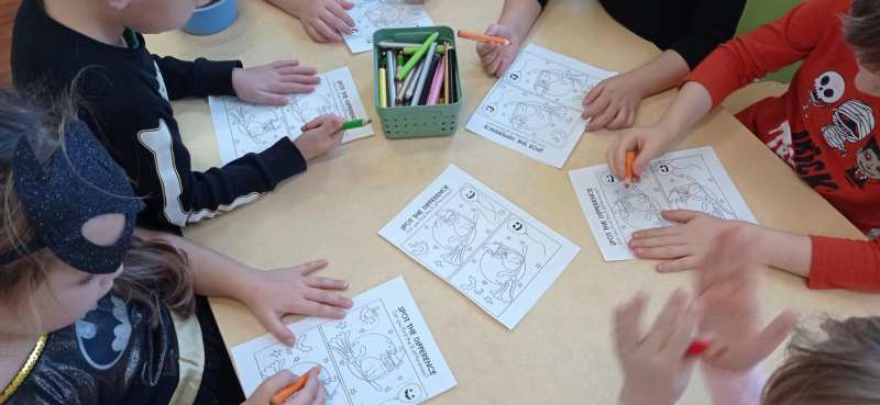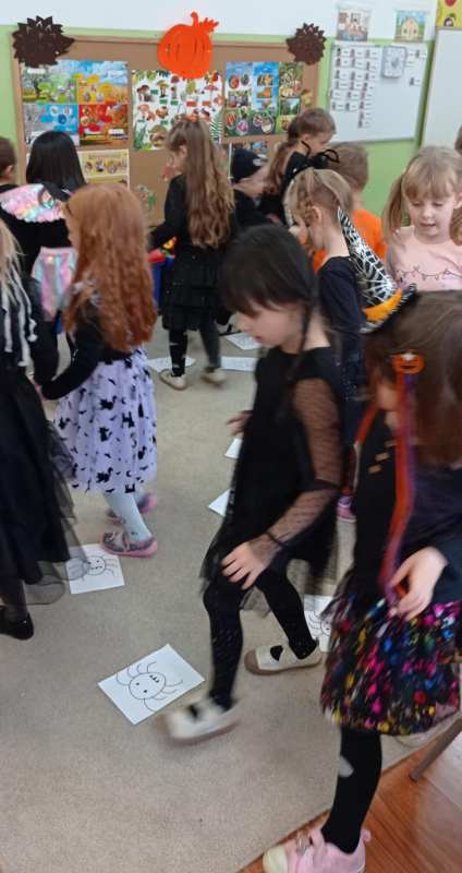 Z okazji Halloween dzieci z naszej grupy wykonały wiele „strasznych zadań. Zaczęliśmy od rozmowy na temat tego święta i jego pochodzenia, a także zwyczajów halloweenowych na świecie. Dzieci ułożyły ducha z puzzli, ćwiczyły spostrzegawczość odszukując różnice między obrazkami i szukając poszczególnych obrazków w kolorowance. Zadaniem matematycznym było przeliczanie obrazków i kubeczków-duchów zgodnie z wylosowaną cyfrą. Dzieci doskonaliły umiejętności matematyczne oraz utrwalały obraz graficzny cyfr prowadząc dynię w tabeli. Dzieci usprawniały małą motorykę wycinając elementy i tworząc z nich nietoperza. Motylki miały też możliwość doskonalenia współpracy podczas tworzenia z kolegów żywej mumii z rulonów papieru. Na koniec bawiliśmy się w zabawę ruchową „Pająki. To był „strasznie” fajny dzień!